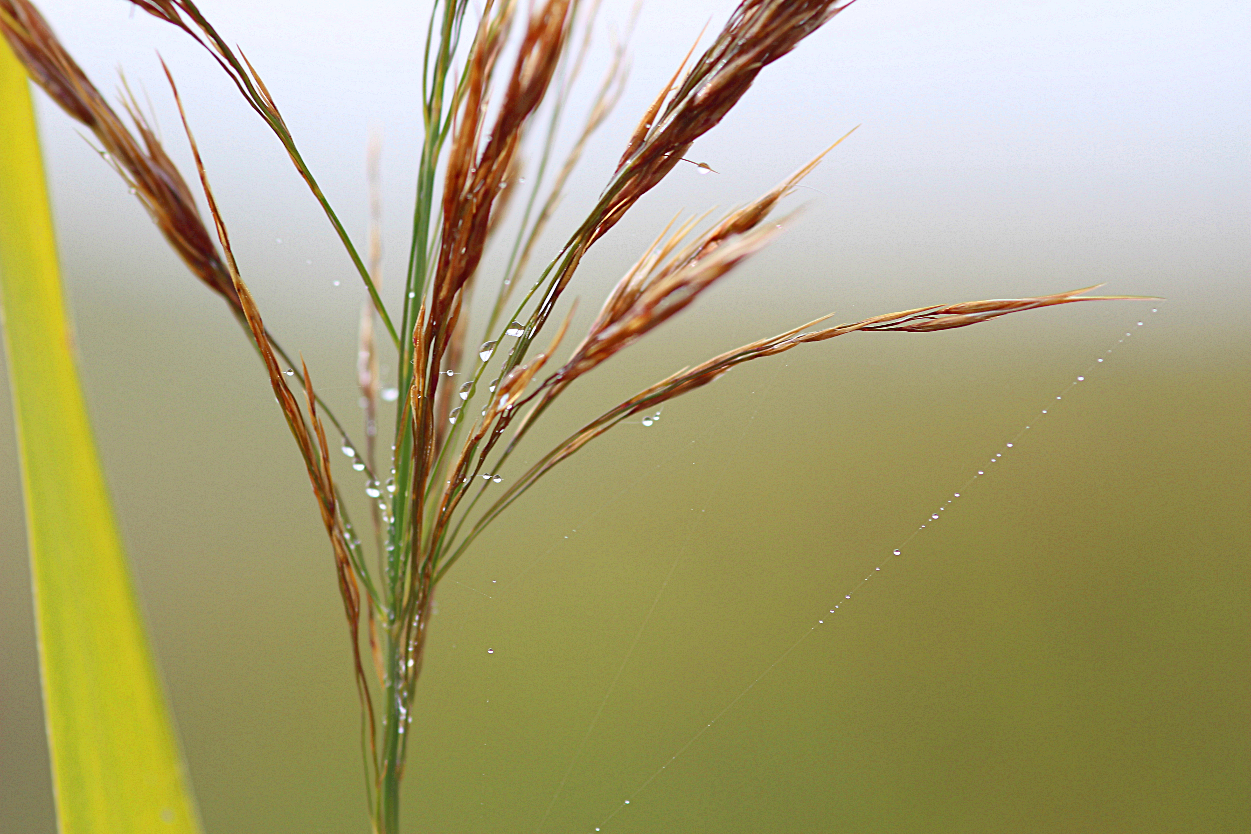 Kastepisarat lepäävät liikkumattomina heinänkorsilla,